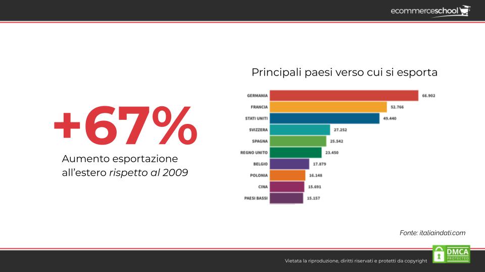 Oggi, rispetto al 2009 l’esportazione di prodotti dall’Italia è aumentata del 67%.
