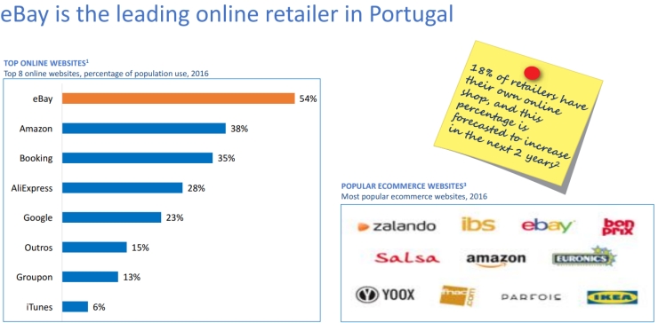 I siti web di ecommerce più diffusi in Portogallo sono capitanati da eBay, che è stato il principale rivenditore online nel paese lo scorso anno. Più della metà della popolazione (54%) ha utilizzato questo sito nel 2016, seguito da Amazon (38%) e da Booking (35%).