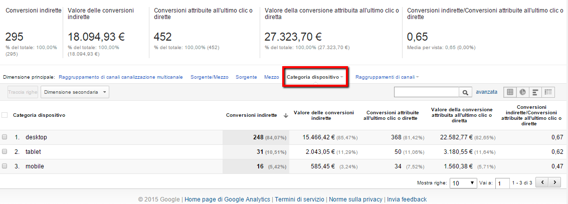 Per vedere il "tasso di conversione indiretta" dei dispositivi mobile sul tuo ecommerce, ti basterà andare su Google Analytics al percorso Conversioni >> Conversioni Indirette ed impostare come dimensione principale "categoria di dispositivo".