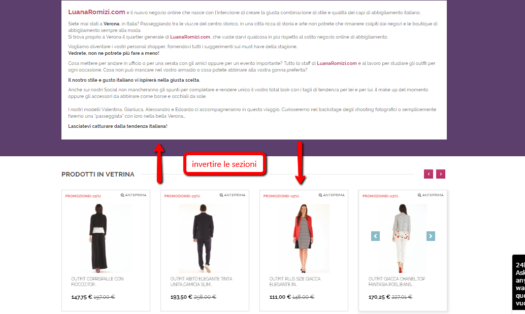 I prodotti in vetrina sonno troppo bassi: meglio spostarli in alto al posto del testo seo, oppure (ancora meglio) direttamente sotto le slide in alto.