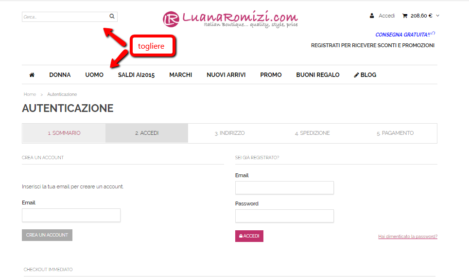 Meglio fare una unica voce “Outlet” ed inserire i saldi stagionali in un sottomenù a tendina. - La scritta “registrati per ricevere sconti e promozioni” è priva di link.