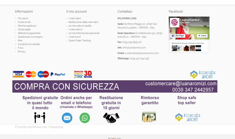 Da sostituire con “spedizioni gratuite in tutta Europa”. - “Ordini anche per telefono o email” va bene, solo che le icone devono essere cliccabili e rimandare alla mail e a whatzupp.