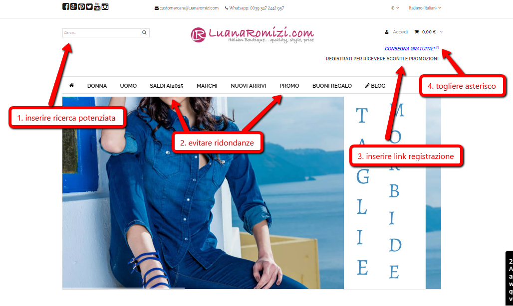 Si consiglia di inserire una ricerca potenziata per aiutare l’utente a trovare quello che cerca, del genere di Doofinder o cVetta. - Tra le voci del menù è presente “Saldi al 2015” e “Promo”. Se per gli addetti ai lavori si tratta di due offerte diverse, per il visitatore in cerca di sconti può causare confusione.