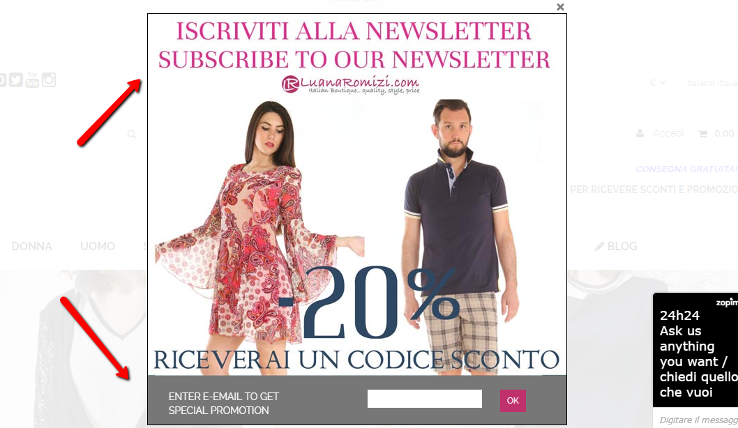 Appena atterrati sul sito si apre il classico popup di iscrizione alla newsletter.