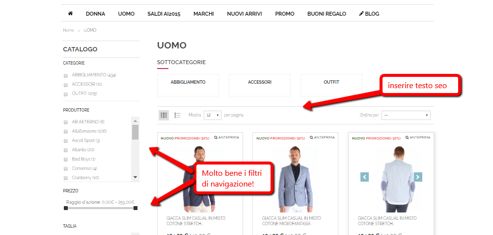 Manca il testo seo: è importante inserirlo il prima possibile in tutte le pagine catalogo se si vogliono indicizzare per i motori di ricerca.