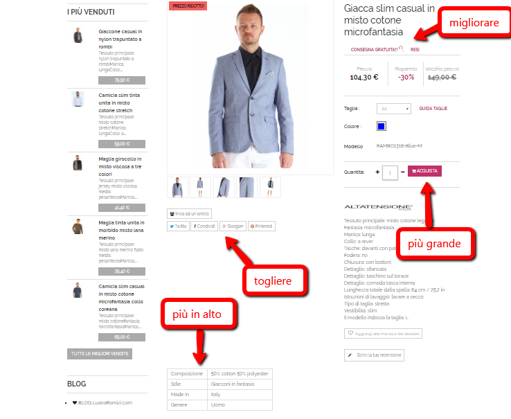 I pulsanti “invia ad un amico” e social vanno tolti in quanto sono distrazioni. Al loro posto, alzare la tabella informativa che si trova troppo in basso.
