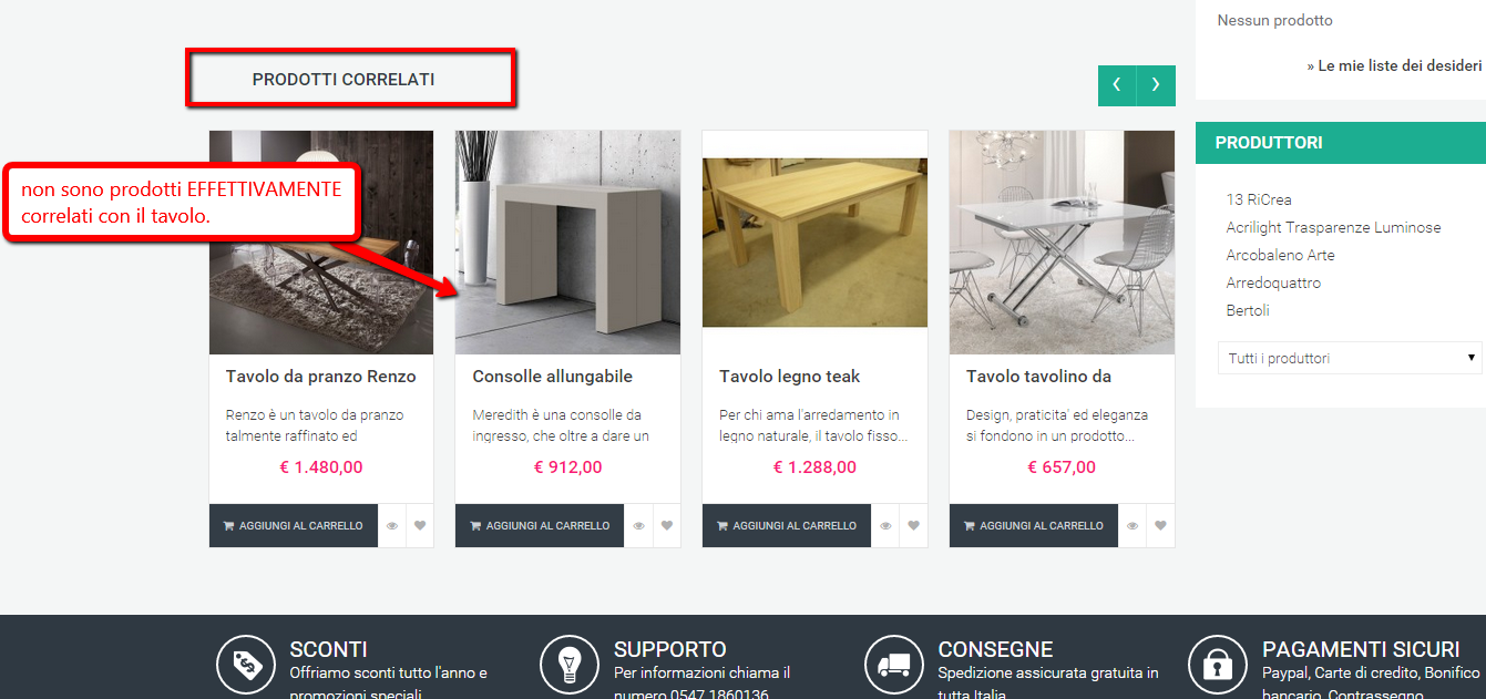 E' importante che i prodotti raccomandati/correlati siano effettivamente utili al cross-selling, pertanto devono essere o prodotti simili oppure prodotti complementari (nel caso del tavolo potrebbero essere le sedie).