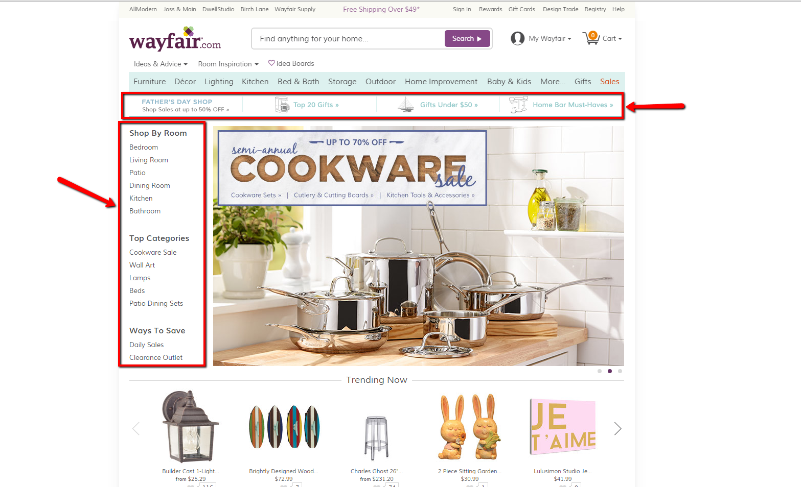 Di seguito l'esempio di Waifair che oltre al menù supplementare sulla sinistra offre anche un sottomenù principale: