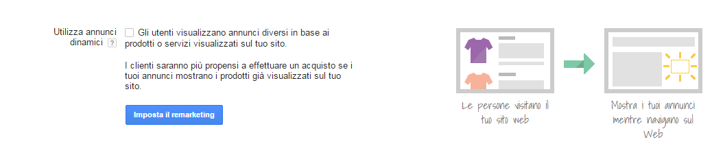 La schermata successiva ti chiede se utilizzare il Remarketing Dinamico. Da pochi mesi è possibile utilizzarlo in combinazione con i video Youtube, ma non è questo il nostro caso. Lascia la casella in bianco e clicca sul pulsante “Imposta il Remarketing”.