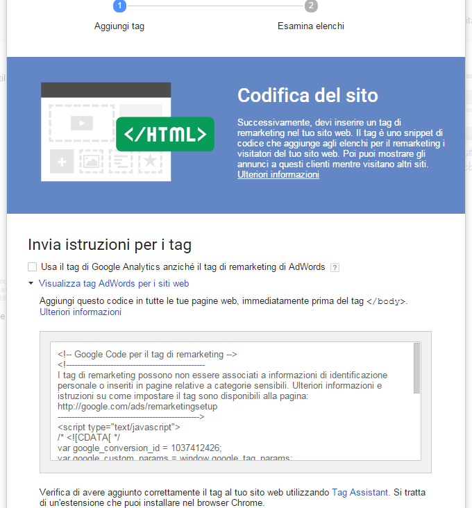 Ti appare ora una finestra in sovraimpressione con un codice da installare nel tuo sito. Puoi implementarlo da solo oppure inviarlo al tuo responsabile Ecommerce per affidargli l’integrazione. Tale codice va installato su tutto il sito. Solo nel passo successivo andrai a dire a Google quale tipo di visitatori selezionare in base alle tue esigenze.