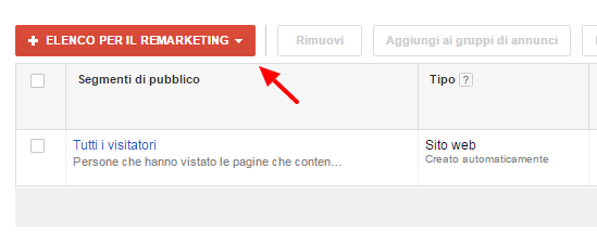 Considerato però che il nostro obiettivo è un altro (far vedere un annuncio video solo a chi ha visitato la sezione Saldi Uomo sul nostro sito), procediamo a creare un nuovo Elenco per il Remarketing, cliccando sul pulsante rosso.