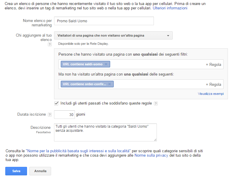 Inseriamo un nome per il nostro elenco di Remarketing e decidiamo chi aggiungere al nostro elenco. Il nostro obiettivo è selezionare chi ha visitato una categoria di pagine (Saldi Uomo) e che, tuttavia, non ha acquistato.
