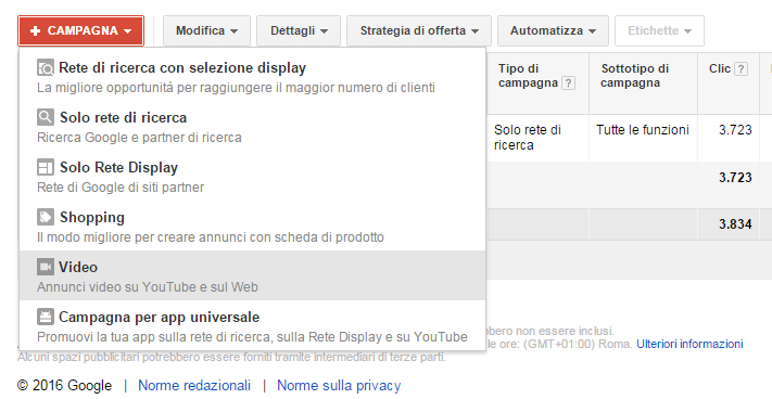 Ora che hai terminato la selezione del target puoi creare la tua prima campagna video. Torna sulla schermata principale e clicca sul pulsante rosso “+ Campagna” e poi su “Video”.