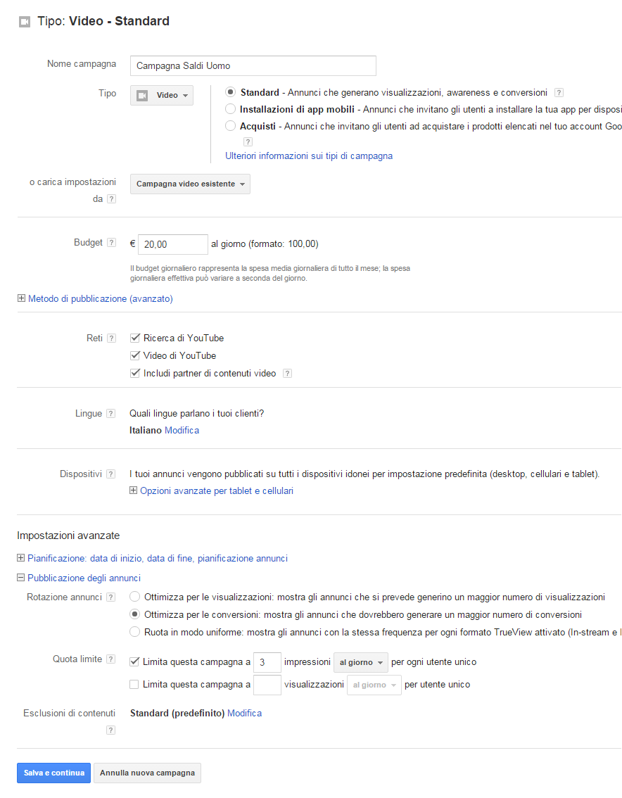 Dai un nome alla tua campagna e inserisci il Budget che hai prefissato, la lingua e l’eventuale esclusione o potenziamento dell’offerta per i dispositivi mobili. Nota che, in basso, la pubblicazione degli annunci è ottimizzata per conversione e che ho inserito un limite massimo giornaliero di 3 impressioni al giorno per utente unico.
