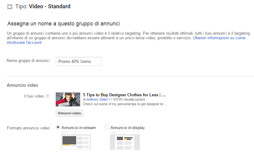 Il secondo step consiste nella creazione del gruppo di annunci e nell’inserimento del video promozionale. Ti consiglio di caricare il video sul canale ufficiale Youtube del tuo Ecommerce così da avere poi più dati sulle sue visualizzazioni.
