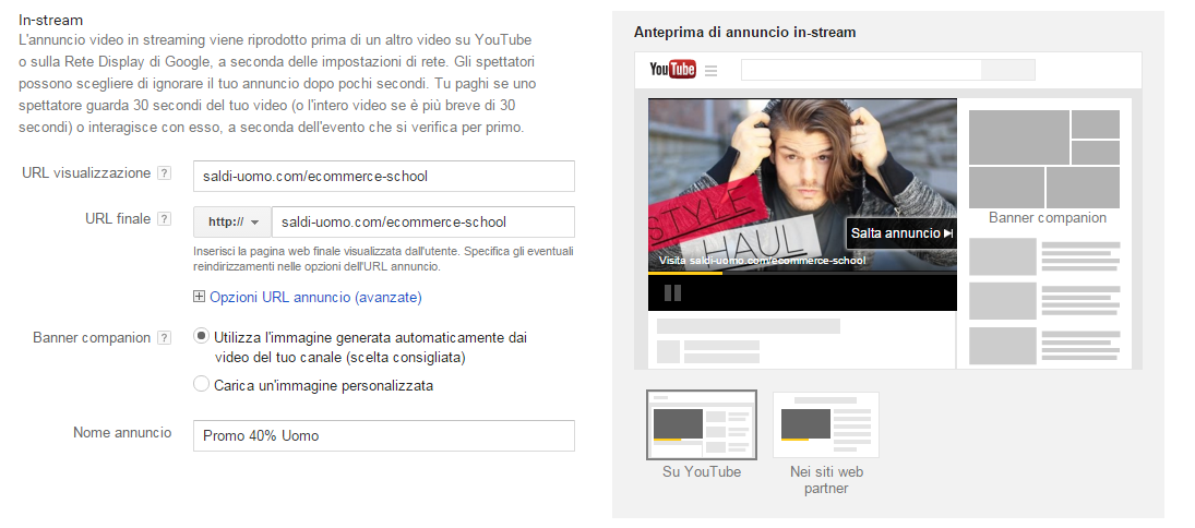 Come vedi, puoi scegliere tra annuncio “In-Stream” ed “In-Display”. Per i nostri obiettivi scegliamo l’annuncio “In-Stream” che ci permette di pagare solo quando l’utente visualizza almeno 30 secondi del nostro video. Per informazioni più approfondite sui due tipi di annunci ti rimando alla guida ufficiale Adwords.