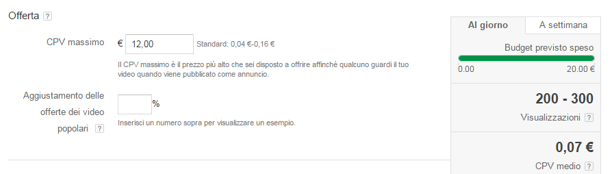 Inserisci quindi un CPV (Costo massimo per Visualizzazione) per la tua azione di Remarketing su Youtube. Molto probabilmente il costo per visualizzazione sarà abbastanza basso poiché l’interazione degli utenti col video sarà alta.
