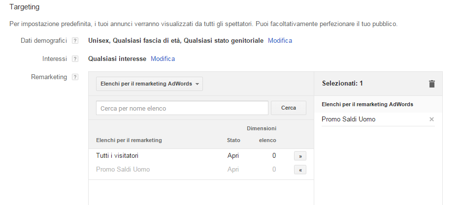 Nella sezione Targeting a fine pagina puoi selezionare il tuo elenco creato ad Hoc pochi minuti prima “Promo Saldi Uomo”.