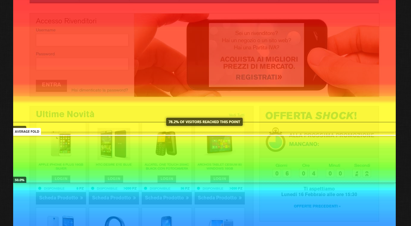 Questa mappa visuale divide lo schermo in fasce di colore che vanno dal rosso (tante visite) al blu (poche visite) e ti mostra fin dove scorrono in basso la pagina i tuoi visitatori.
