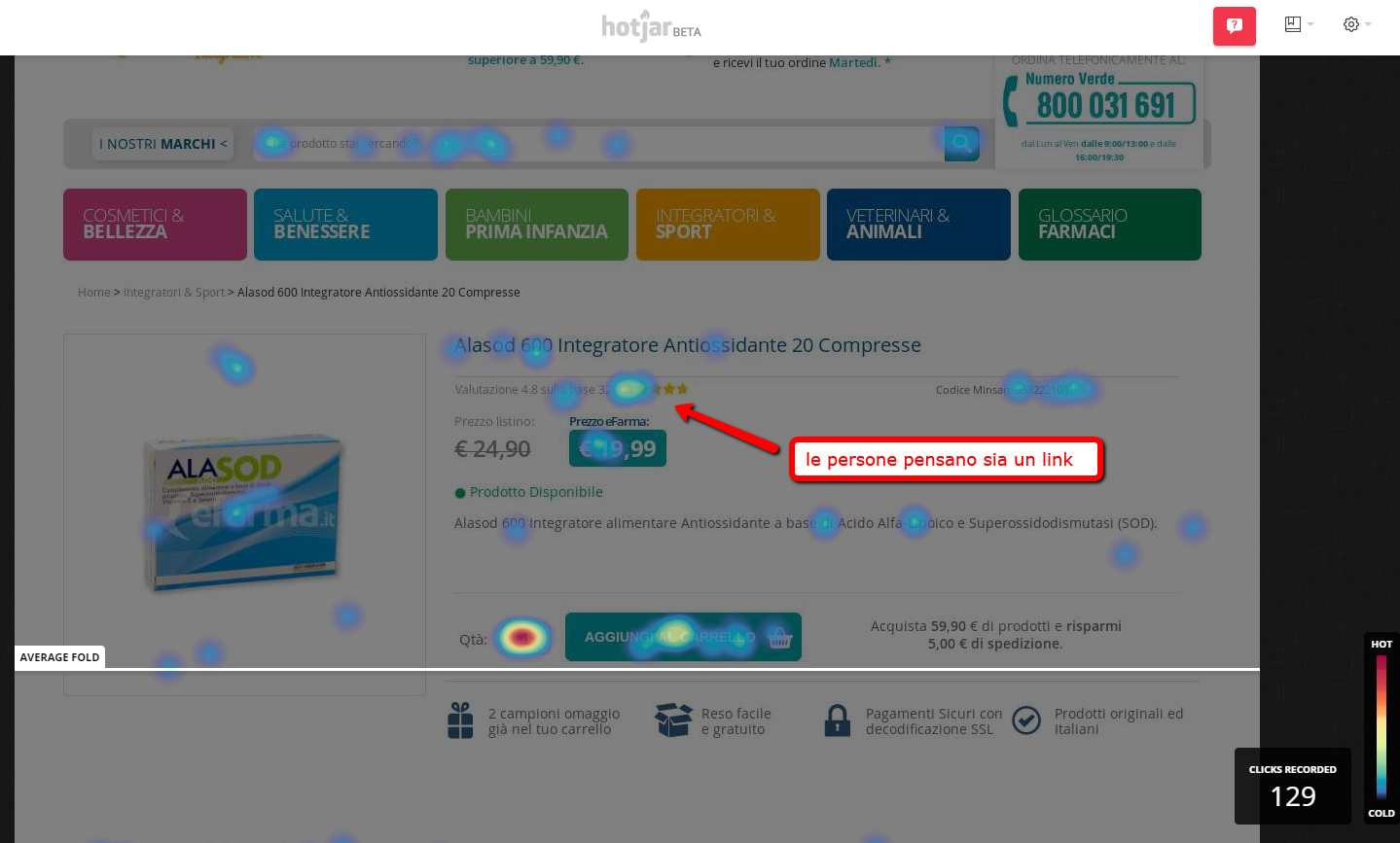 Nell'esempio sotto: gli utenti tendono a cliccare sulla Valutazione del prodotto che però non contiene alcun link. Ecco un primo problema da sistemare!