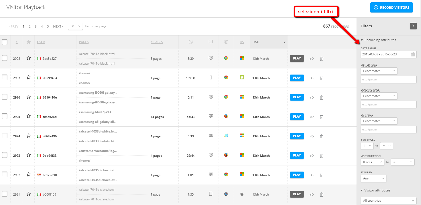 Sono presenti tutta una serie di filtri che ti permettono di isolare solo le registrazioni che ti interessano, sulla base di attributi come il dispositivo utilizzato (desktop, tablet o mobile), il luogo geografico di provenienza, la pagina di atterraggio, la durata della visita e altro ancora.