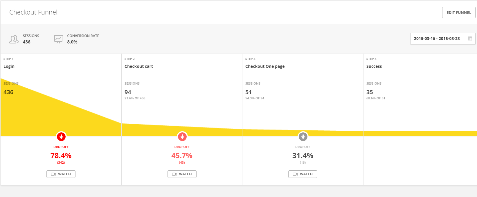 Per ciascuno step del Funnel di conversione, potrai riguardarti le registrazioni video per vedere di persona cosa succede all'utente che abbandona il funnel in uno specifico punto.