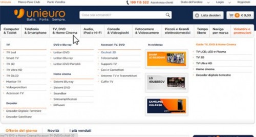 Oltre a questi plug-in anche il menù è molto importante in quanto il cliente che ha meno le idee chiare probabilmente vorrà esplorare le vostre offerte e valutarle singolarmente. Sia che il tuo sito sia sartoriale sia se il tuo template non lo prevede considera nel tuo ecommerce un menù, chiaro, con scorciatorie e dinamico. Ti riporto l'esempio di un buon esempio di Unieuro: