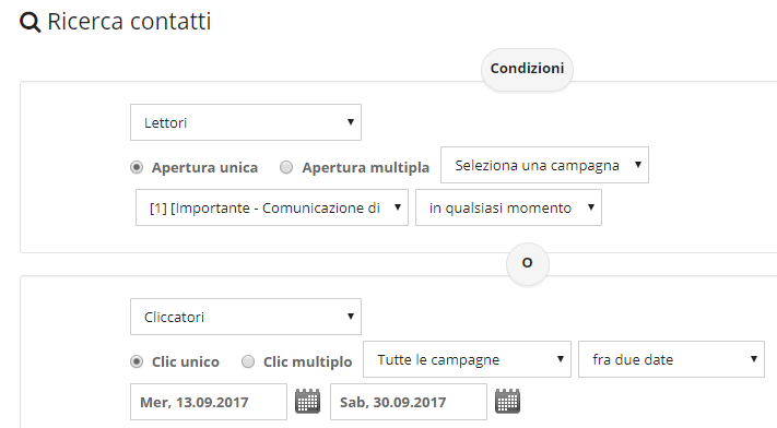 La possibilità di segmentare il target di invio è un’altra utile funzionalità di SendinBlue. Il motore di segmentazione permette di definire delle regole per selezionare una parte dei contatti per inviare la campagna solo a utenti con determinate caratteristiche, sesso ed età ad esempio, o determinati comportamenti (email aperte tra il 01/01/2014 e oggi).