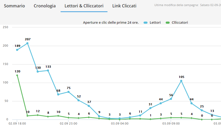 Le statistiche però consentono anche di accedere alla cronologia delle aperture e dei clic per contatto, in modo da da avere un quadro più completo sul comportamento degli utenti, sapere in quali momenti della giornata vengono aperte le email ed effettuare un segmentazione avanzata dei contatti.