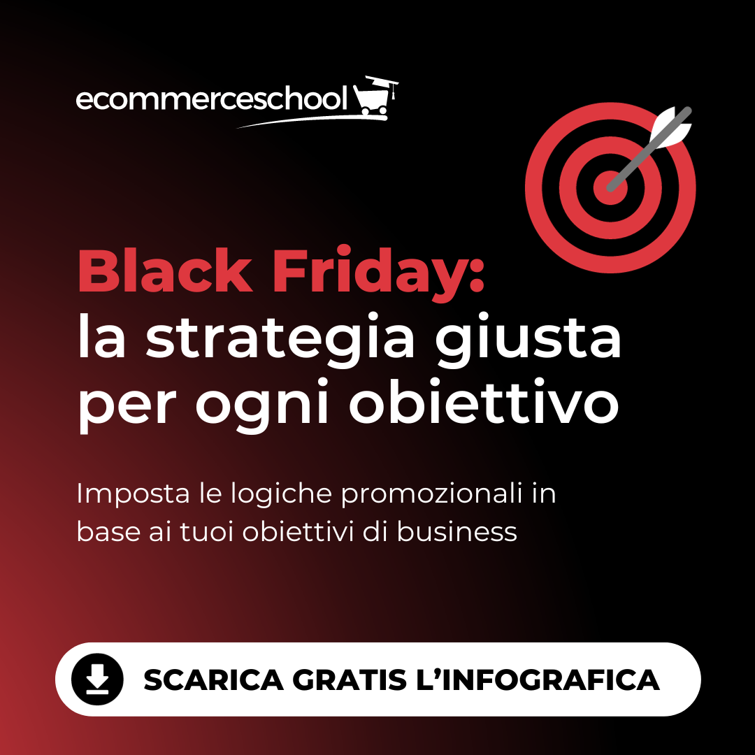 Per aiutarti a impostare le tue logiche promozionali in base ai tuoi obiettivi aziendali, abbiamo realizzato l’infografica “Black Friday: la strategia giusta per ogni obiettivo”.
