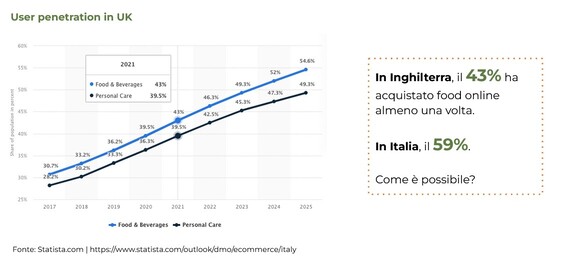 Nonostante la grande differenza tra l’Italia e i due paesi citati, i numeri racchiudono un altro dato molto importante che ha suscitato in noi una riflessione: nel Regno Unito il 43% della popolazione ha dichiarato di aver acquistato food online almeno una volta, mentre in Italia il 59%. Come si spiega?