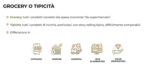 Per grocery si intendono i classici prodotti in vendita nei supermercati, per tipicità, invece, prodotti di nicchia, particolari, con uno storytelling peculiare. Il modello grocery necessita di investimenti costanti e ha alte barriere di ingresso proprio per la necessità di capitali iniziali.