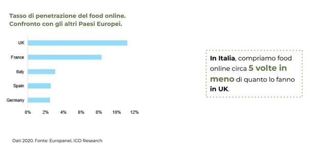 Secondo Europanel, gli italiani acquistano cibo online 5 volte in meno rispetto al Regno Unito e 3 volte in meno rispetto alla Francia.
