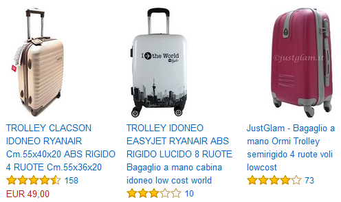 In certi casi risulta importante specificare alcune caratteristiche cruciali nella decisione di acquisto; nel caso dei trolley sopra, l’elemento chiave è l’idoneità per i voli low cost.