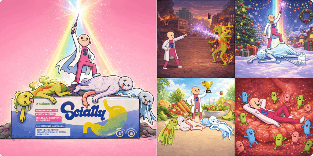 Attraverso l’utilizzo dell’AI come strumento creativo, abbiamo sviluppato, oltre a Dr. Scially (la personificazione del beneficio dell’integratore), tre antagonisti: